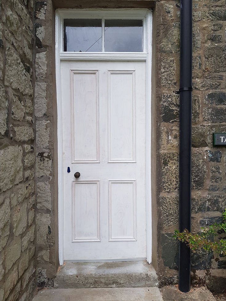 New mortice and tennon door, made in our workshop and fitted today in Kilchoan. All ready for a top coat of paint.
